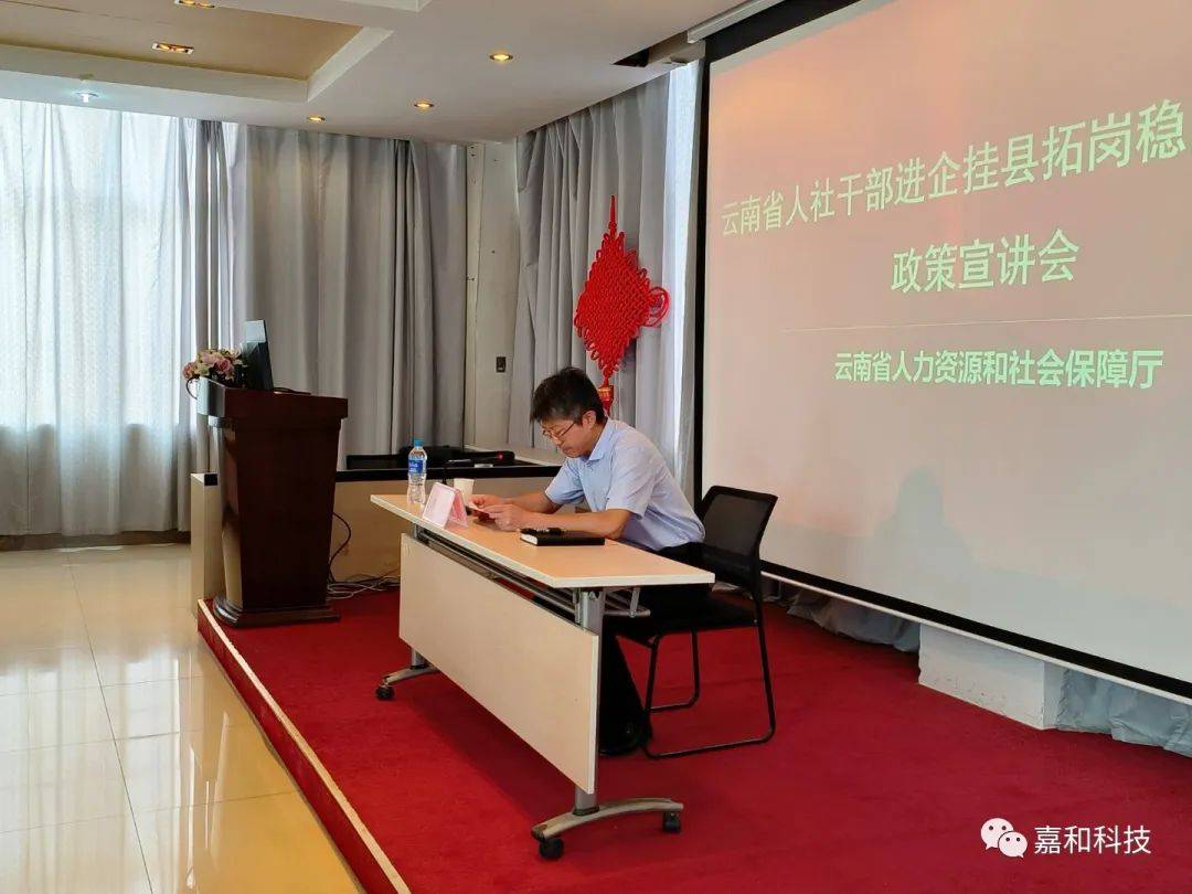 in order to thoroughly implement the spirit of the 20th National Congress of the Communist Party of China, promote the implementation of the stable employment policy, effectively play the role of stabilizing expectations and strengthening confidence, and achieve the overall stability of the employment situation in the province. Recently, the Yunnan Provincial Human Resources and Social Security System's special action policy seminar on "Cadres entering enterprises and counties to expand posts and stabilize posts" was held in Jiahe Science and Technology Co., LTD. Guo Pin, deputy director of the Yunnan Provincial Department of Human Resources and Social Security, member of the party group, and relevant leaders attended the meeting.