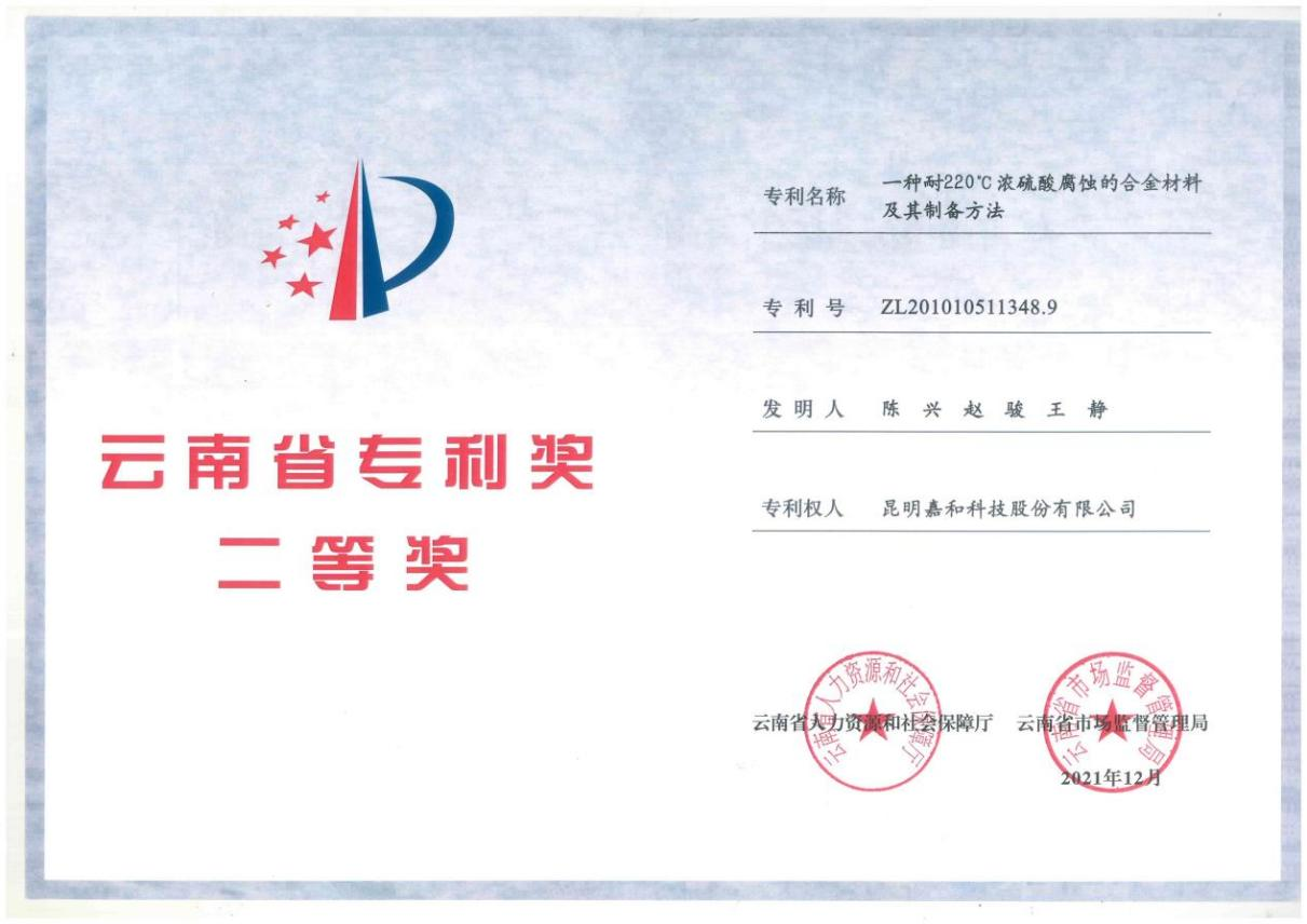 Second Prize of Yunnan Provincial Patent Award